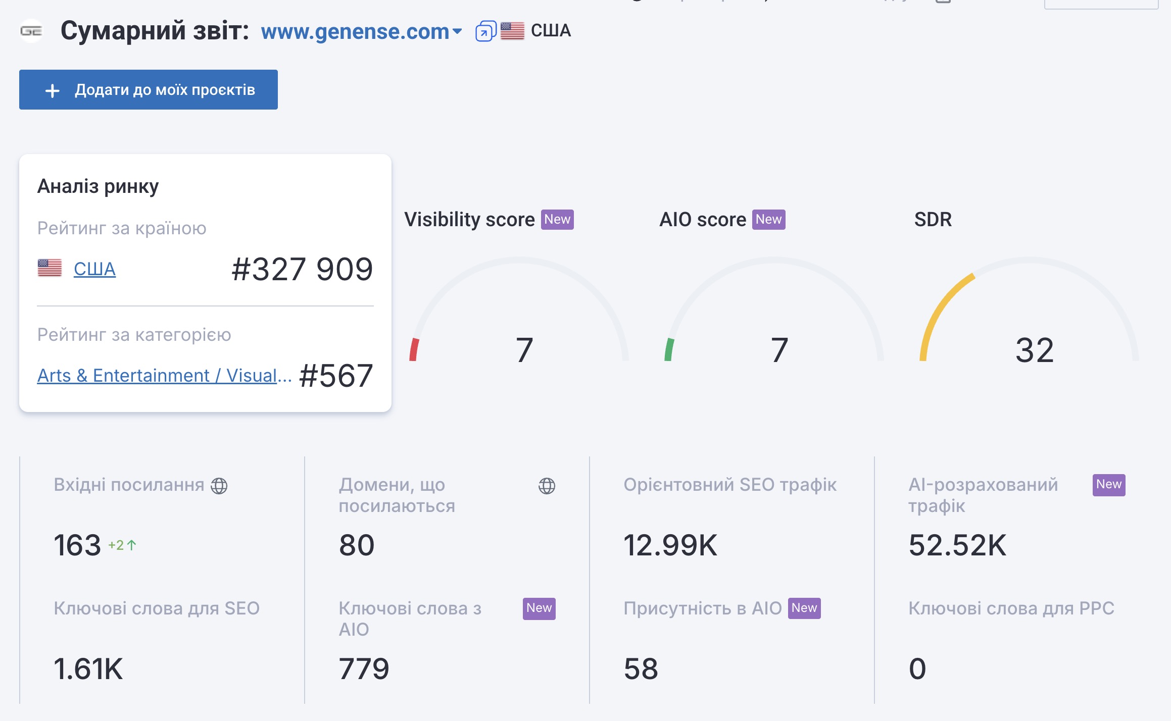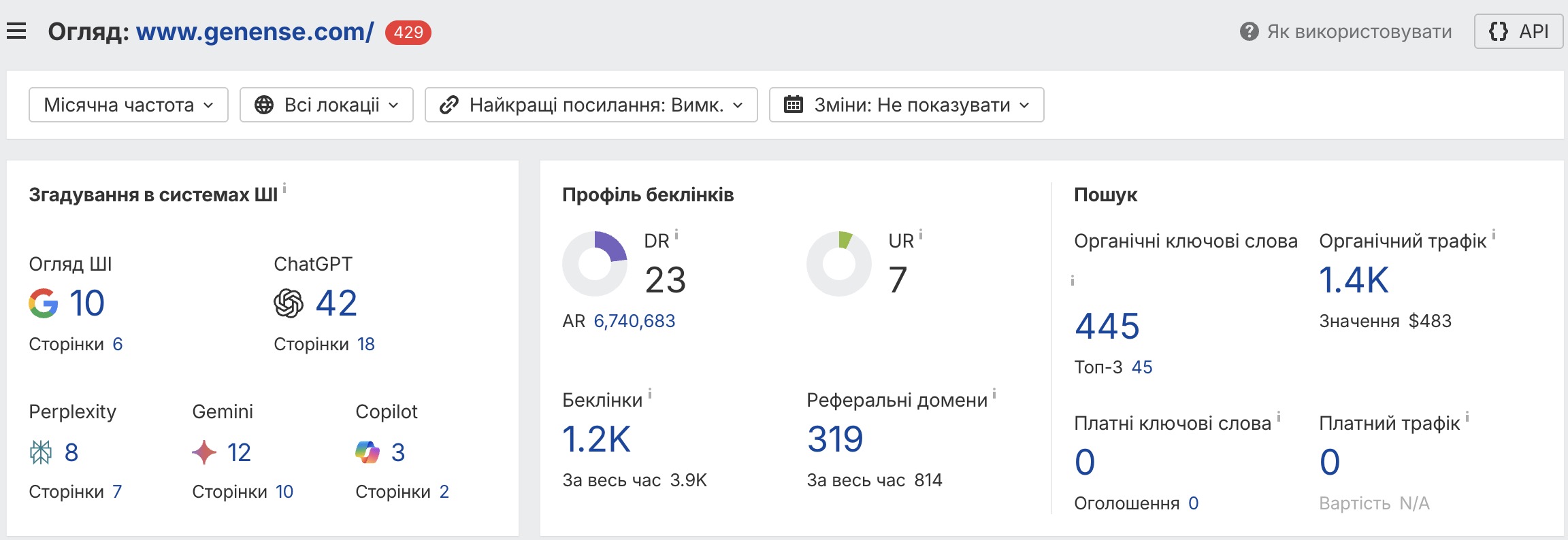 Нижче на скріншотах показано основні показники сайту послуг Genense за період роботи з Tarmedia