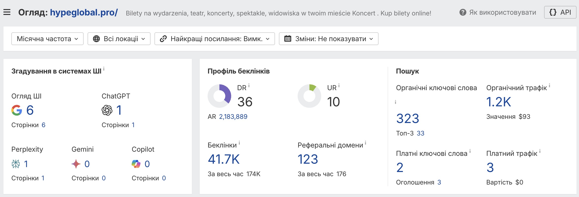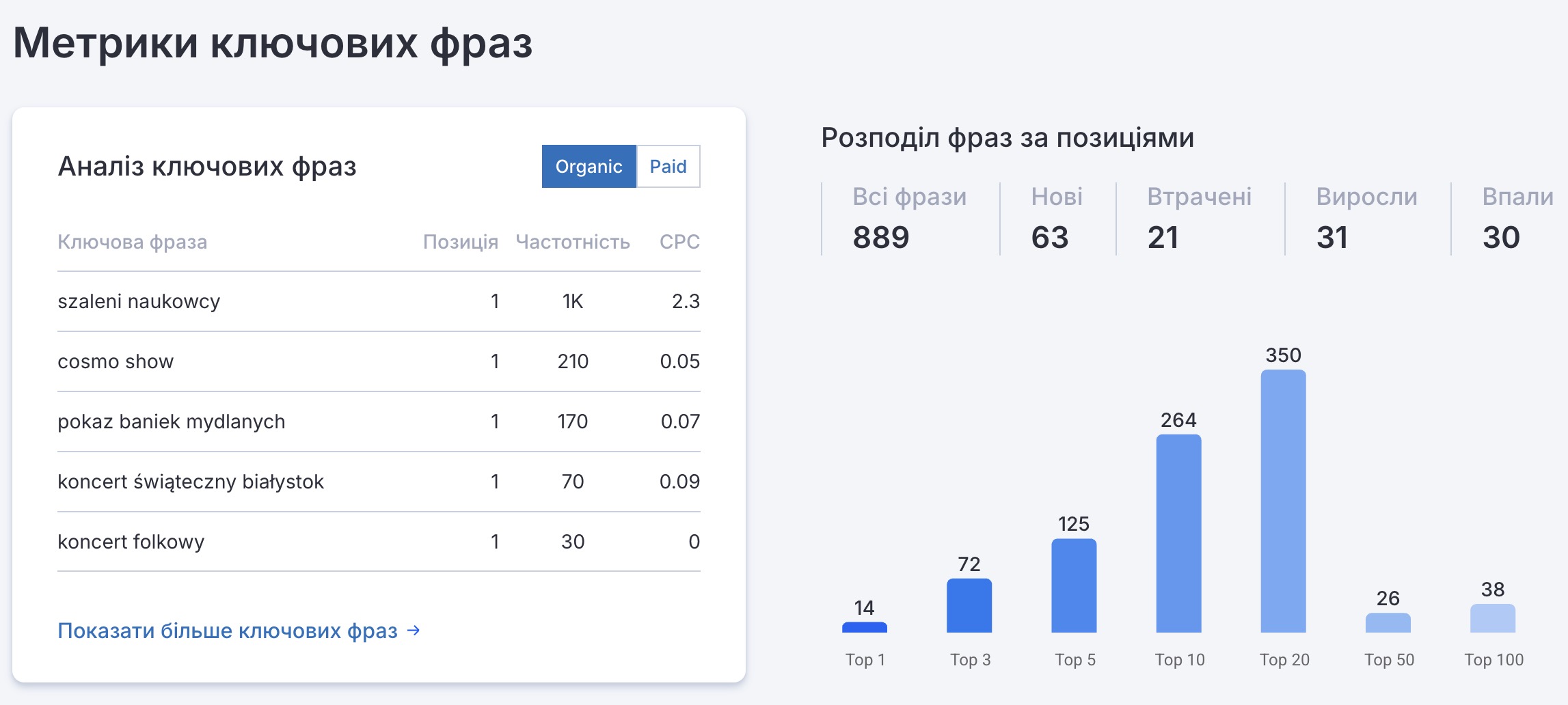 Проєкт з SEO-просування інтернет-магазину квитків на концерти, театри та спортивні події в Польщі. Роботи охоплювали повний цикл SEO: від аналізу ринку та конкурентів до технічної, контентної й зовнішньої оптимізації. Основний фокус — комерційні запити за категоріями заходів та популярними подіями.