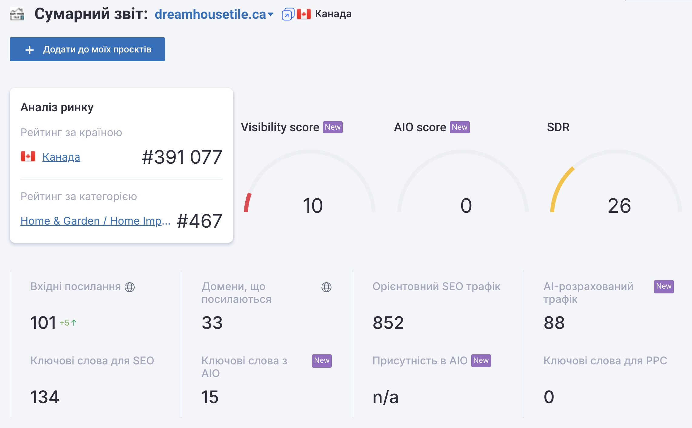 Нижче на скріншотах показано основні показники сайту Dream House Tile за період роботи з Tarmedia